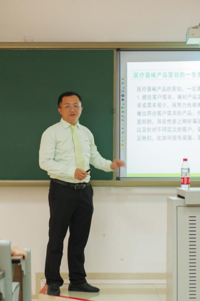 蔡总以分享其“从事医疗行业的初心——赚良心钱,应人民之需求”拉开讲座帷幕。接着,结合本人工作经历和经验,普及关于医疗器械产品的策划、开发、生产、注册认证和营销的知识。产品策划要求抓需求做定位、重创新和注性价比;产品开发实施应充分考虑设计方案和成本等因素;生产产品需注意量产、质检和库存控制等问题;产品注册和认证是关键;产品营销应掌握包装宣传、做好产品定价、降低成本和拓展销售渠道等策略。接近尾声时,蔡总针对教师和学生提出的创业合作伙伴的选择和创业初心等问题做了详细回答。