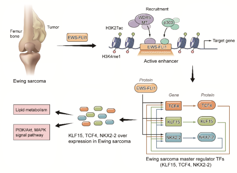 该研究工作通过结合超级增强子谱、mRNA表达谱和核心转录调控环路三个层面的数据,全面展示了Ewing′s肉瘤发生过程中超级增强子介导的转录调控网络,深入阐明了超级增强子驱动EWS-FLI1激活核心转录因子KLF15、TCF4和NKX2-2并形成转录调控环路的过程,揭示了其驱动Ewing′s肉瘤发生发展的特异性转录调控机制。该研究成果为将来研发基于核心转录调控环路的新驱动基因进行靶向治疗提供了重要的理论基础,也为今后肿瘤相关转录调控的研究拓宽思路。