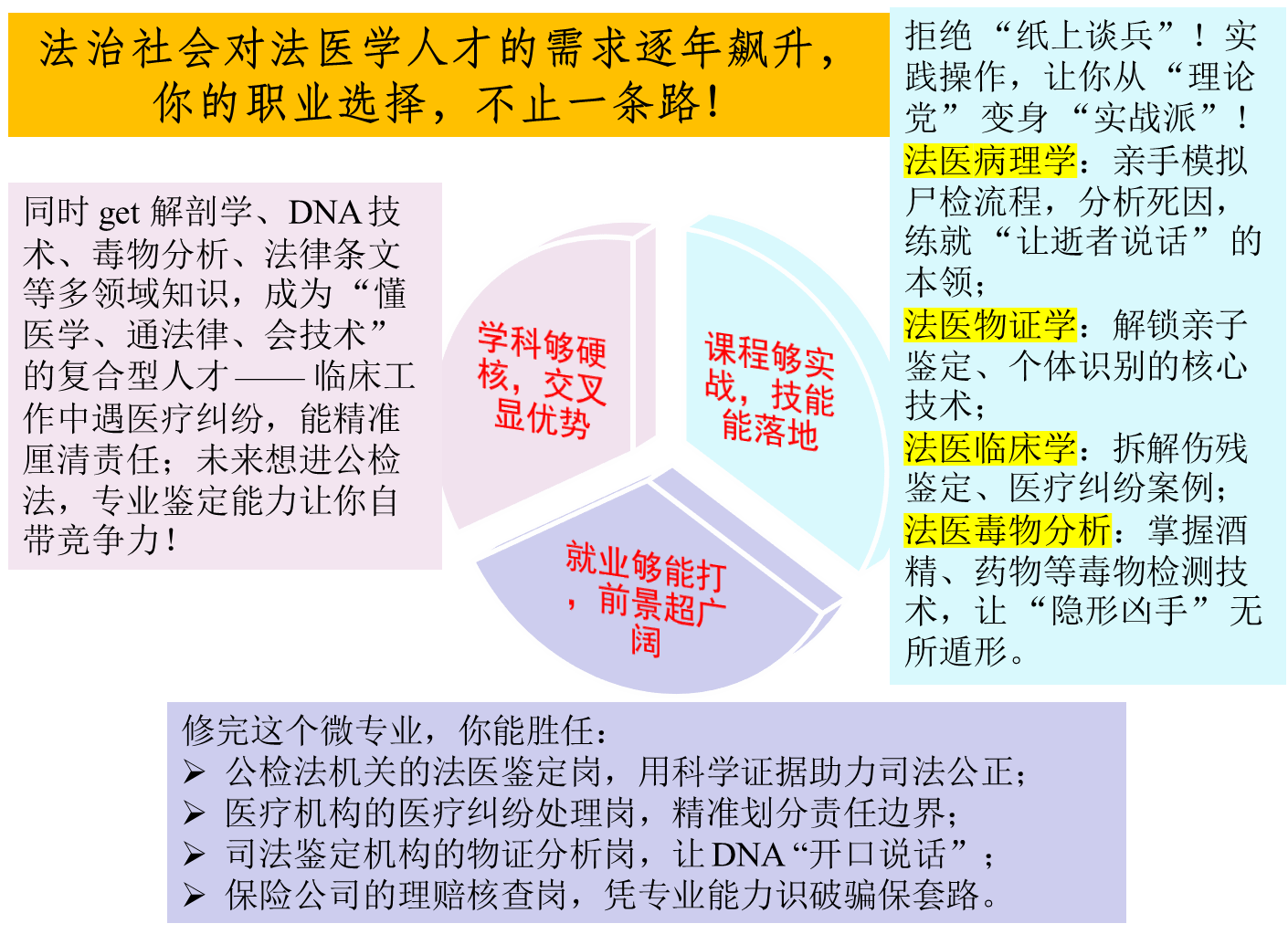 法医学与司法鉴定技术是融合医学、法学、生物学、化学、物理学等多学科的交叉领域,核心是运用医学及自然科学理论与方法解决司法实践中的医学问题。该领域涵盖法医病理学、法医物证学、法医临床学、法医毒物分析等分支,2022年法医学成为医学门类一级学科,人才培养体系日趋完善。随着我国法治进程推进,司法公正、医疗纠纷处理等需求激增,法医学人才在公检法机关、医疗机构、司法鉴定机构、科研院校、保险公司等领域供不应求。本微专业通过理论与实战结合,培养学生运用医学知识解决法律问题的能力,强化法律伦理意识,提升综合素养与社会适应力,助力学生在司法实践、临床工作中更好地服务社会。