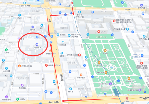 地铁:乘地铁3号线至嘉禾望岗站,转乘2号线至纪念堂站下车,步行600m即到宾馆(车费约¥7元,时间约55分钟)。